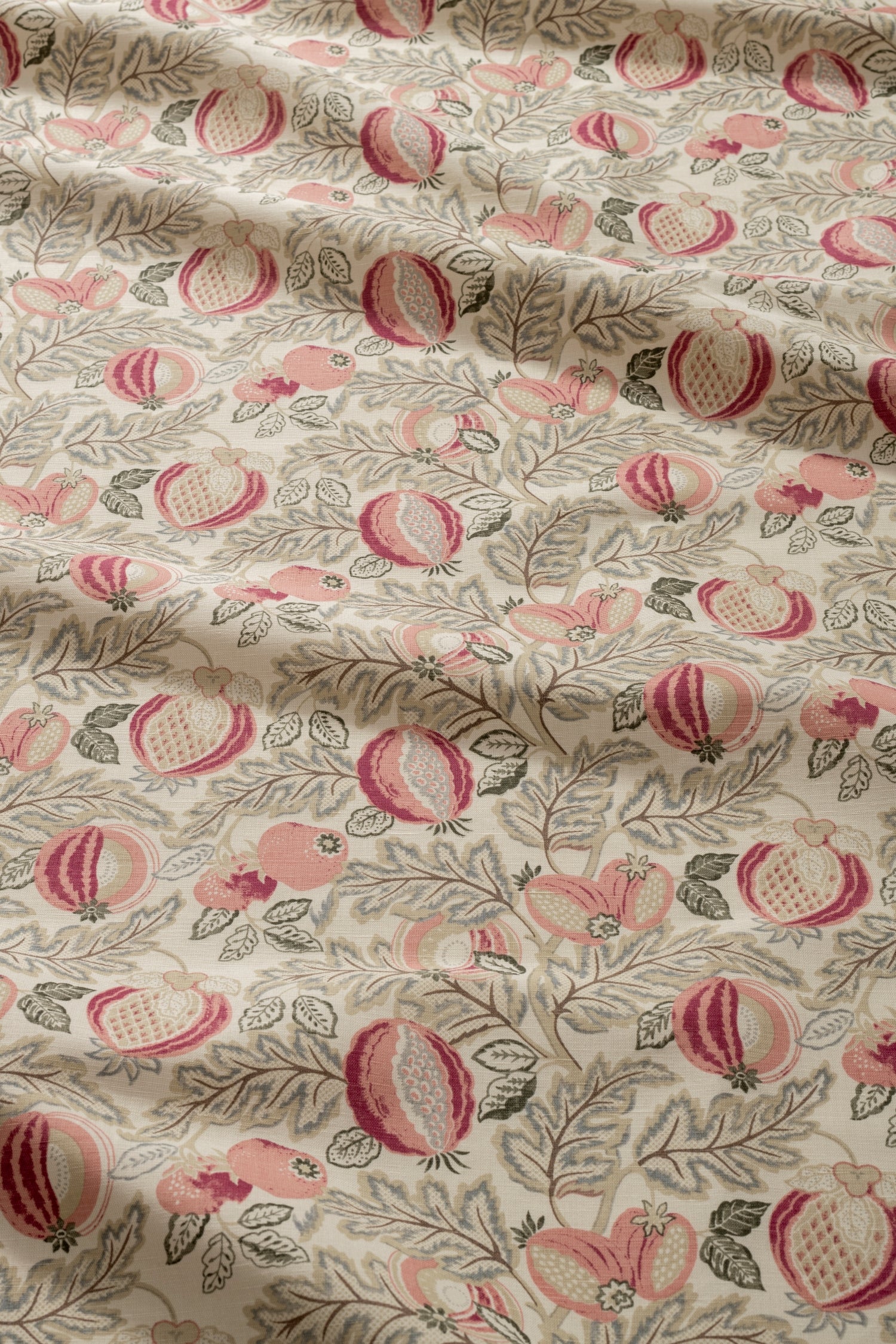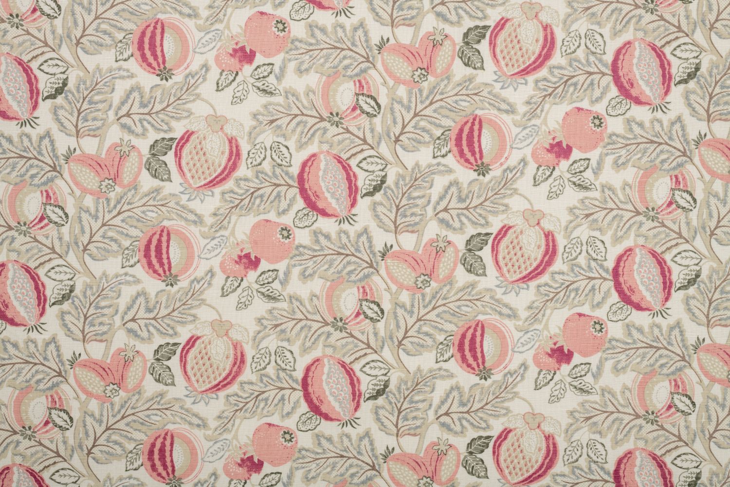 The Anar Garden fabric is hand printed on a blend of Linen/Cotton base, it features the Pale Pink Anar that come together to form an all-over pattern. The delicate vines and leaves make this fabric a charming addition to your spaces. This fabric is suitable for curtains, blinds and upholstery.