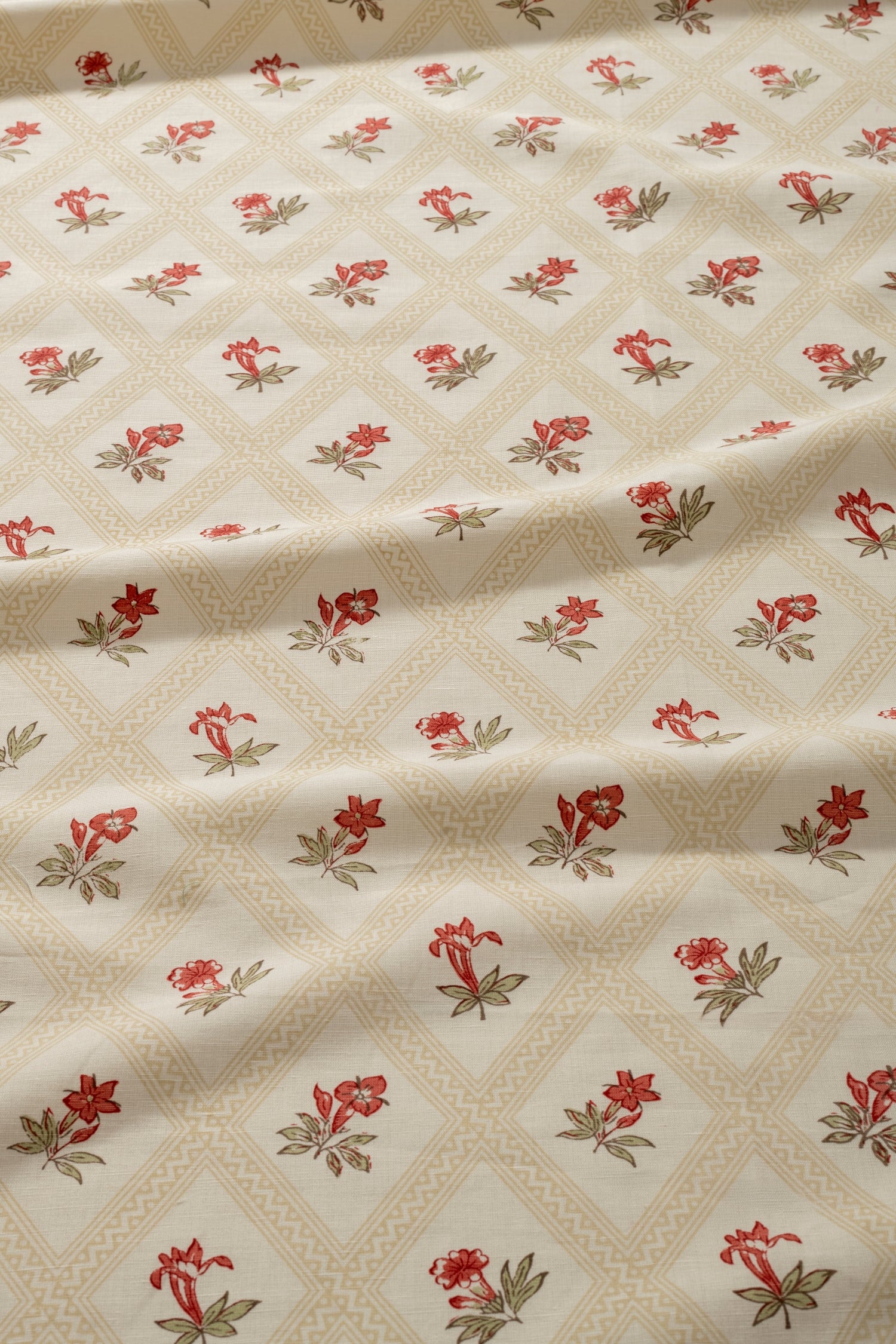 The Botanical Trellis fabric features a hand printed cluster of blooming flowers encased in a delicate trellis frame in delightful shades of pale gold. The fabric is suitable for curtains, blinds and light upholstery