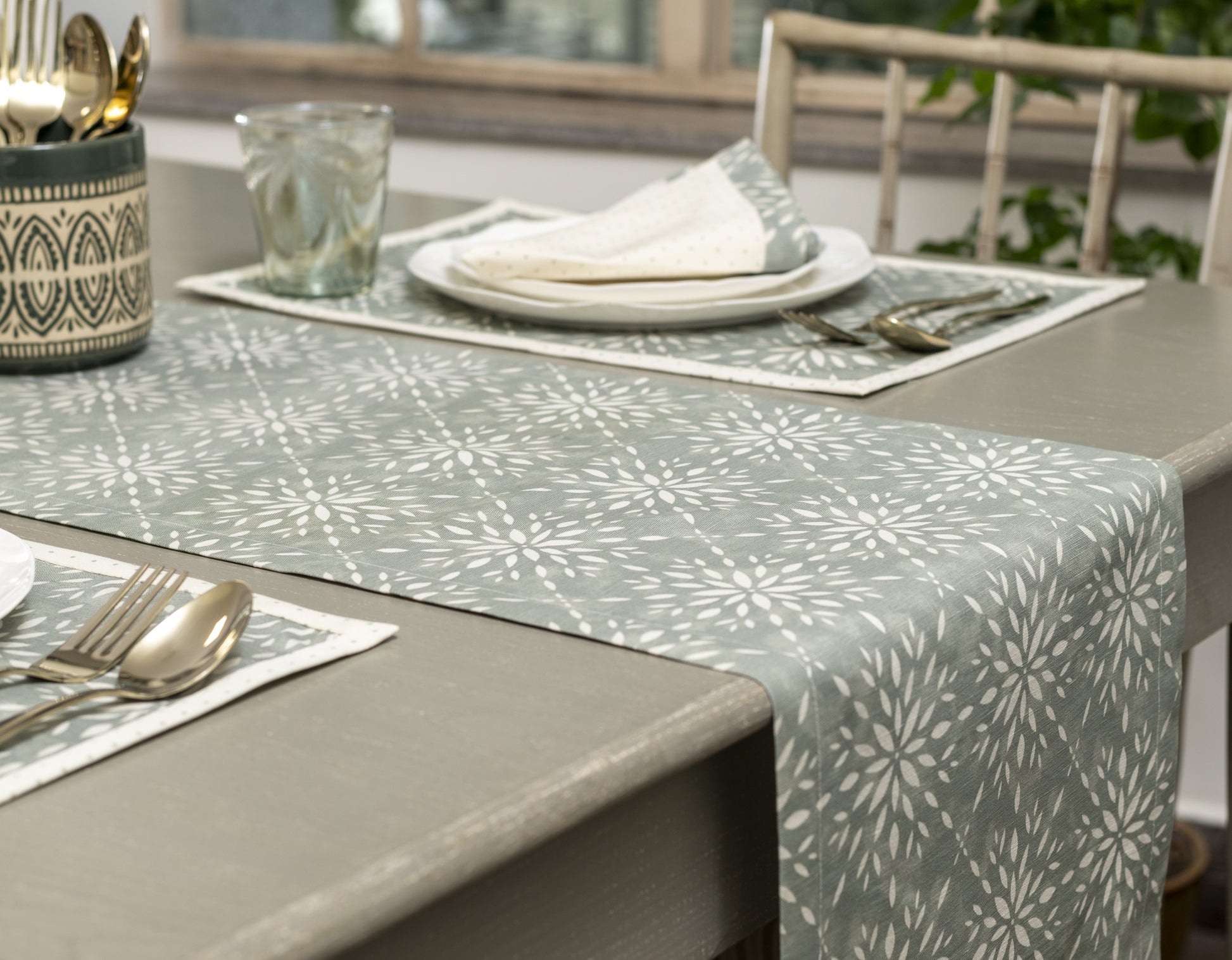 The Fleck Trellis table runner features a hand printed tonal trellis combining of a linear and geometric pattern that is distinctive in design. This hand-printed table runners is a beautiful and unique way to add personality and style to your dining table.