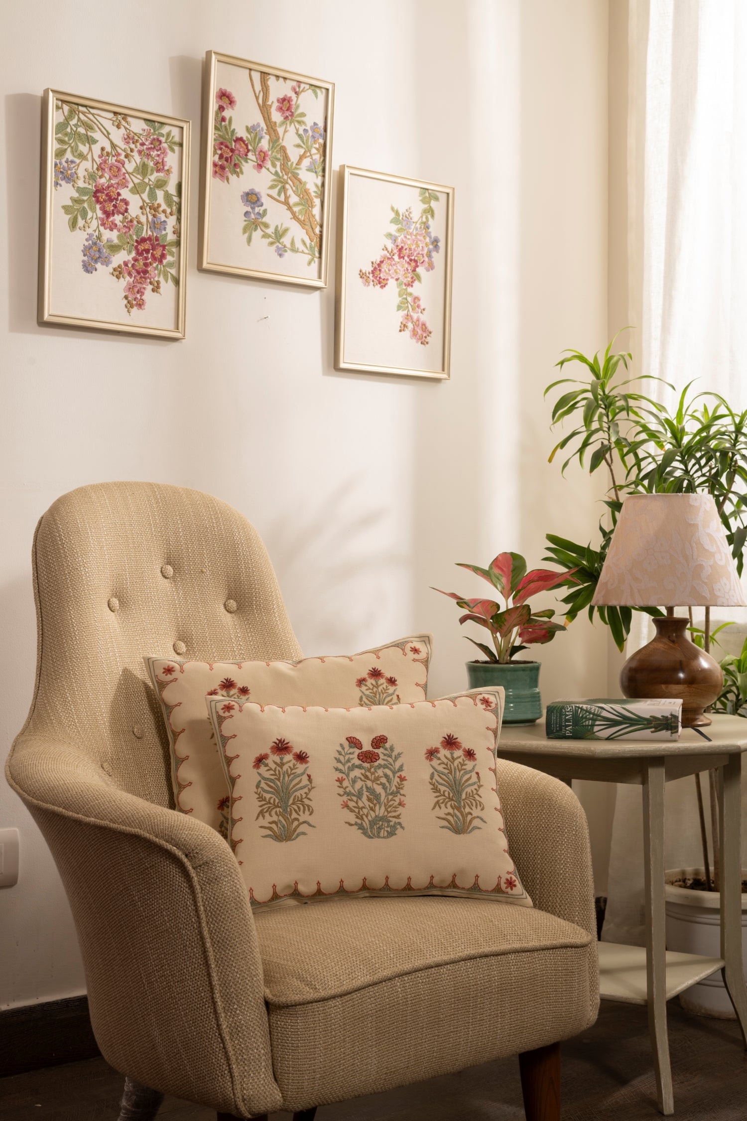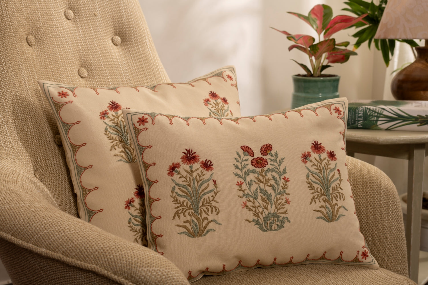 The row of Mughal Flowers come together to create the perfect spring cushion. This cushion is made with a premium quality Linen/Cotton fabric. It has delicate hand embroidered flowers in hues of rust and hints of green.